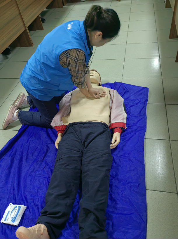 采用線下培訓和實操演練相結合的形式,培訓心肺復蘇的定義、適用范圍、操作流程、注意事項等施救知識及應急處置實操內容。培訓中,社區專業全科主管護師通過講解現實案例以及人體模型示范的方式,讓大家更為真切、迅速了解應急救護的有關知識和技巧,并就如何正確心肺復蘇的操作流程進行了指導。